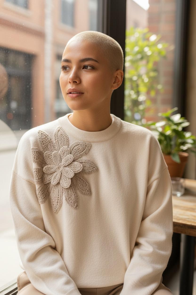 Feita de malha densa e macia, daquelas que têm peso suficiente pra cair bem no corpo, transmitindo sensação de aconchego mas sem ser volumosa.