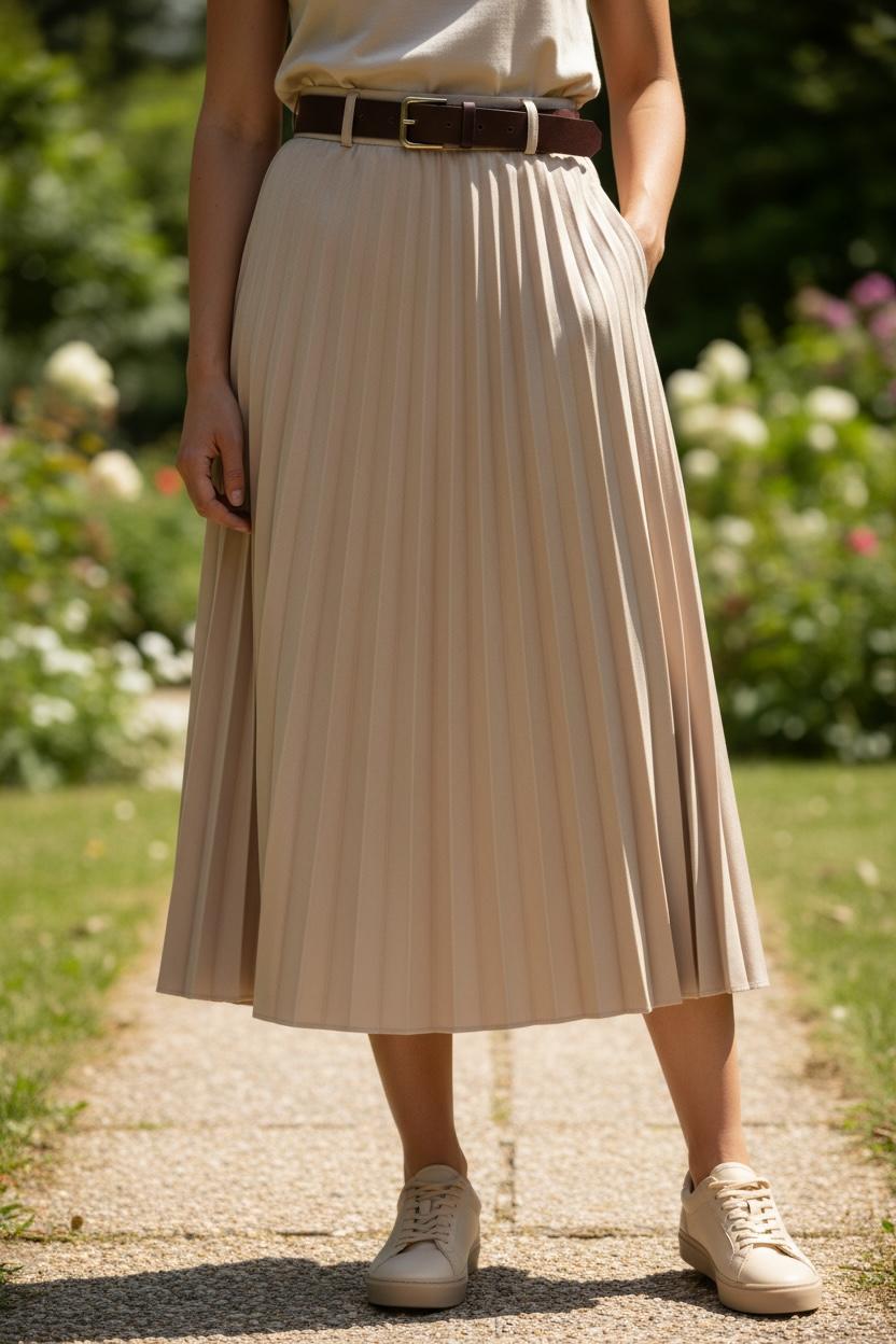 Saia comprida com pregas, tecido macio tipo pele de pêssego, e cinto largo castanho de fivela dourada incluído.